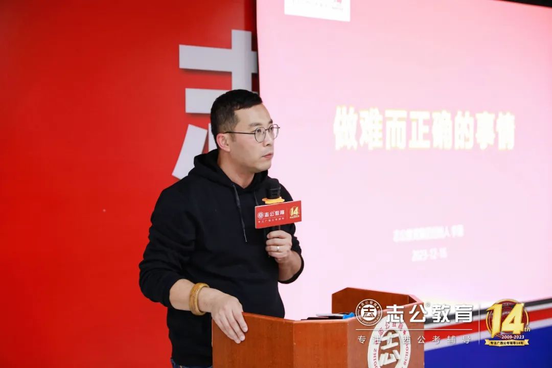 16日上午9點(diǎn)許,董事長(zhǎng)李勇發(fā)表致辭,他認(rèn)為:“聚焦是一種力量”,對(duì)于志公教育而言,聚焦就是專注廣西公考輔導(dǎo)。