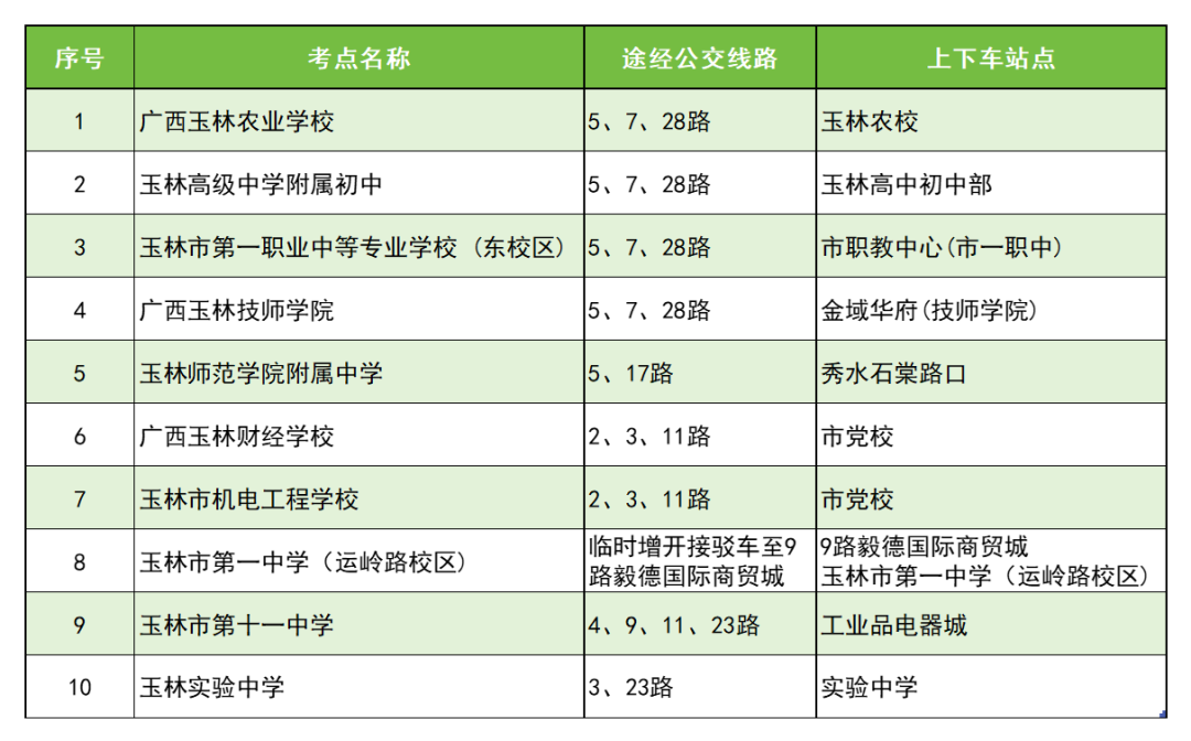 玉林市第一中學(xué)(運嶺路校區(qū))考點11:00-11:30,16:30-17:00 在考點安排公交車和值勤人員,負責(zé)將考生接送到9路毅德國際商貿(mào)城站點。