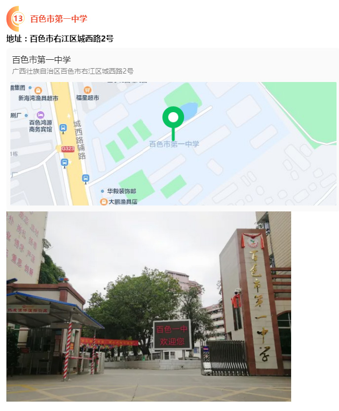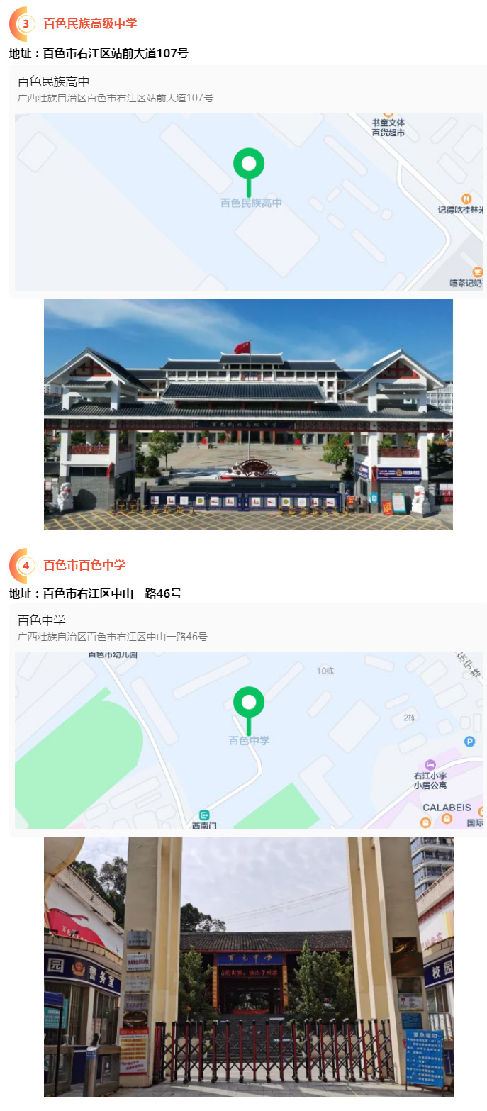 2.請?zhí)崆笆煜た键c地址,做好路線、住宿的安排。本次考試參考人數(shù)較多,考點分布分散,建議考生考前實地察看考點,確認考點入口位置,防止走錯考點。請充分考慮考點周邊交通通行情況和停車場地容量,合理安排出行方式,預留充足時間,確保考試當天按時到達。另外,考試期間百色市及各考點學校周邊的住宿比較緊張,請?zhí)崆邦A定。