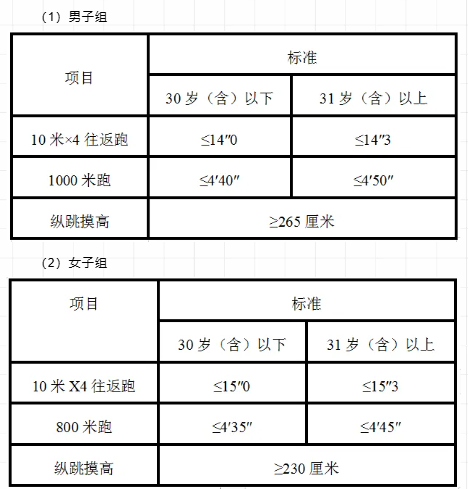 3.參照《關(guān)于印發(fā)公安機關(guān)錄用人民警察體能測評項目和標(biāo)準(zhǔn)(暫行)的通知》(人社部發(fā)〔2011〕48號)的項目及測試規(guī)則,結(jié)合《公安民警體育鍛煉達(dá)標(biāo)手冊》成績標(biāo)準(zhǔn),體能測評的項目和標(biāo)準(zhǔn)如下: