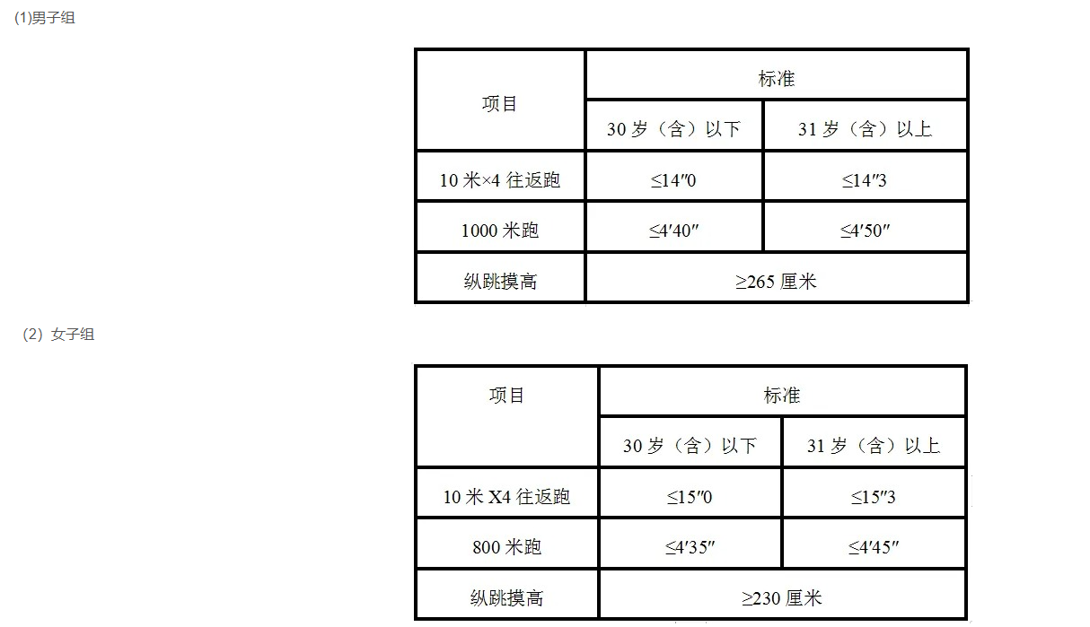 3.參照《關(guān)于印發(fā)公安機(jī)關(guān)錄用人民警察體能測(cè)評(píng)項(xiàng)目和標(biāo)準(zhǔn)(暫行)的通知》(人社部發(fā)〔2011〕48號(hào))的項(xiàng)目及測(cè)試規(guī)則,結(jié)合《公安民警體育鍛煉達(dá)標(biāo)手冊(cè)》成績(jī)標(biāo)準(zhǔn),體能測(cè)評(píng)的項(xiàng)目和標(biāo)準(zhǔn)如下: