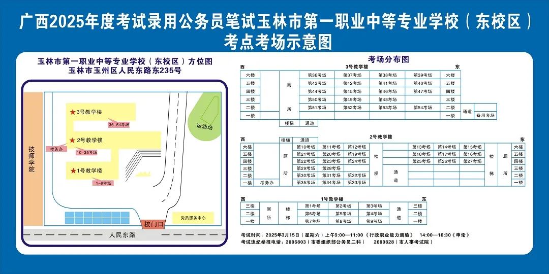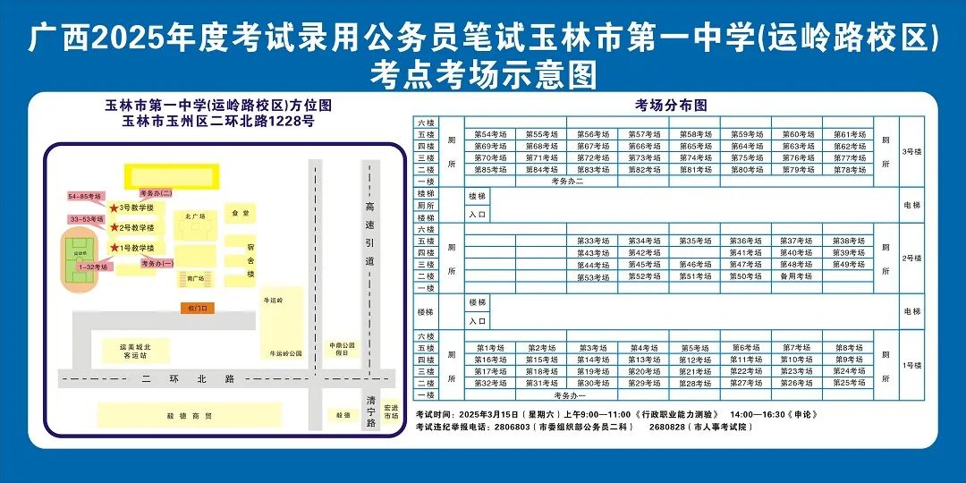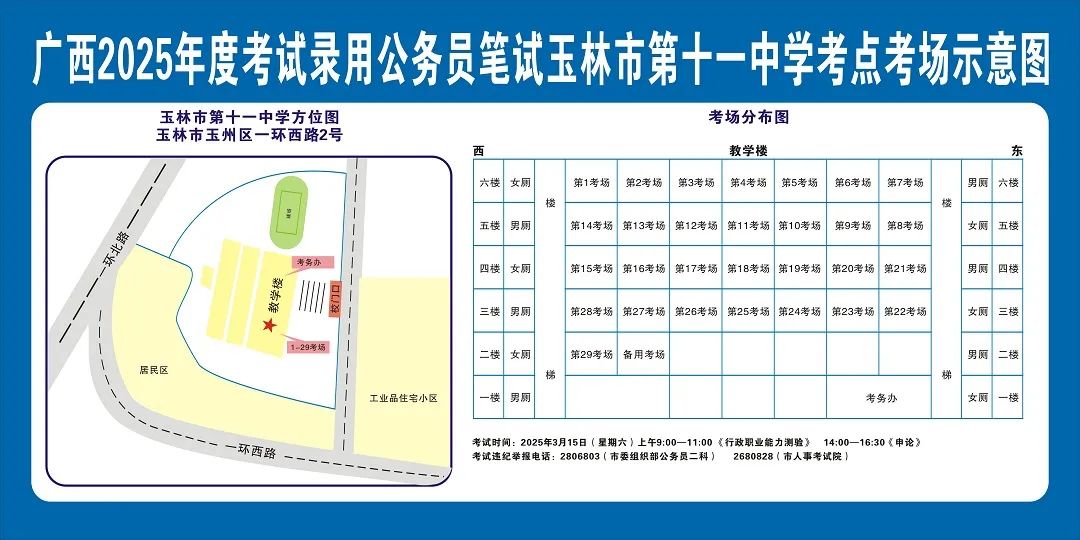 除考試當天考生可以進入考點外,考生不得提前進入考點查看考場(學校將在大門處擺放考場分布示意圖),玉林考區(qū)11個考點的考場布置情況如下: