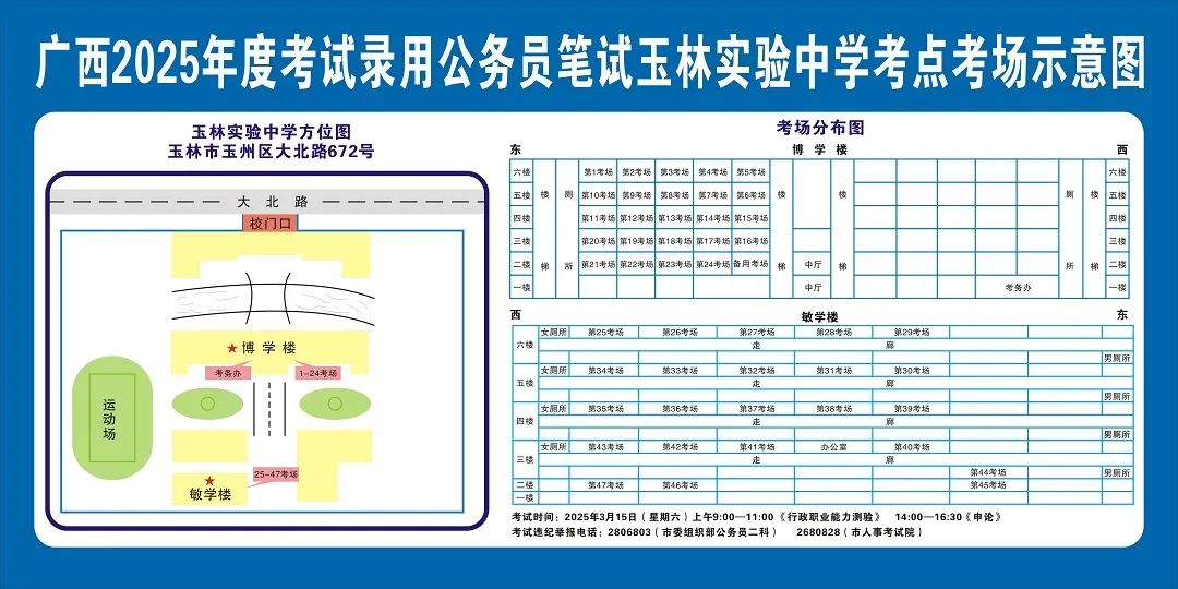 請及時登錄“廣西人事考試網(wǎng)”打印筆試準考證并妥善保管,仔細查看準考證上的考點信息。本次考試玉林市考區(qū)共設(shè)11個考點,各考點名稱及地址如下: