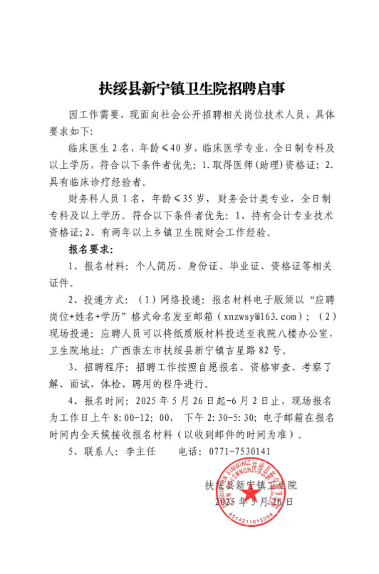 原文標題:扶綏縣新寧鎮(zhèn)衛(wèi)生院招聘啟事
