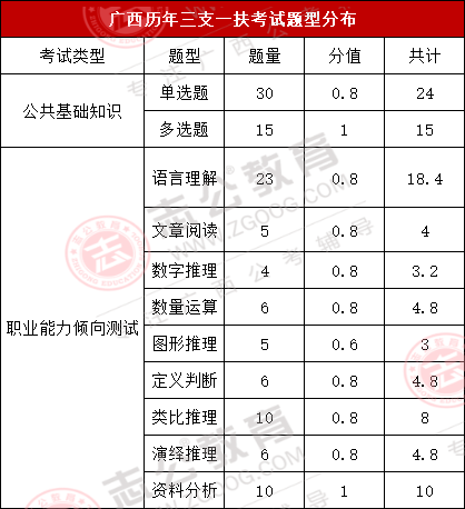 上篇我們寫到,三支一扶的待遇,在廣西這個(gè)待遇還算不錯(cuò),政策上的支持也非常好,那么預(yù)計(jì)這個(gè)月月底出公告的三支一扶,啥時(shí)候筆試呢?2024年廣西三支一扶筆試時(shí)間是7月13日,其筆試科目為《綜合知識》一科,滿分100分?;谕昕忌幕貞洠C合知識內(nèi)容主要包括公共基礎(chǔ)知識和行測職業(yè)能力測試兩個(gè)科目,而各題型的題量及分值如下圖所示: