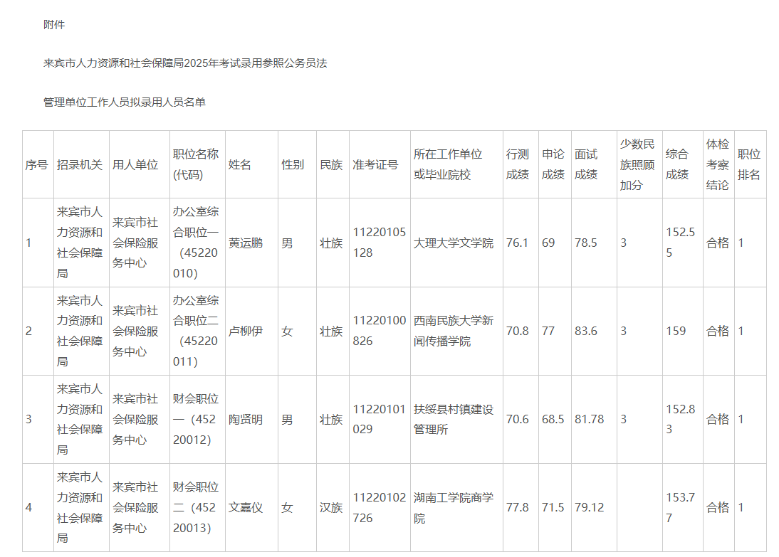 2025來賓人力資源和社會保障局公務員考試錄用工作人員擬錄用人員公示