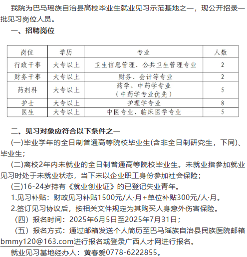 2025年廣西巴馬瑤族自治縣民族醫(yī)院見習(xí)崗位招聘若干人