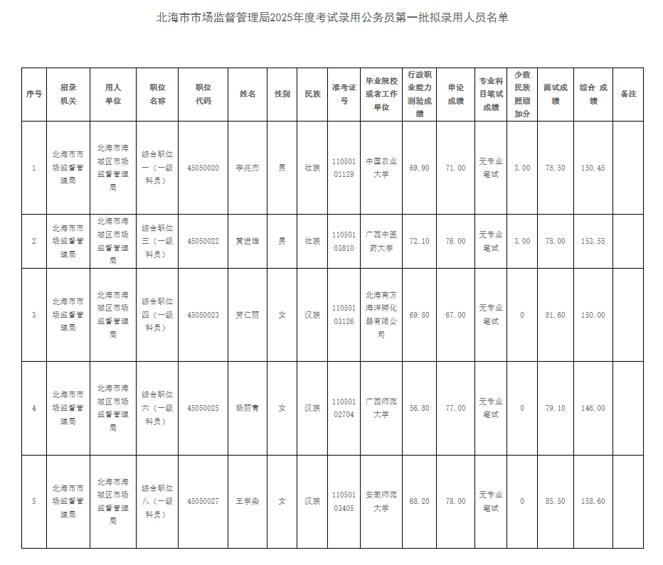 附件:北海市市場(chǎng)監(jiān)督管理局2025年度考試錄用公務(wù)員第一批擬錄用人員名單