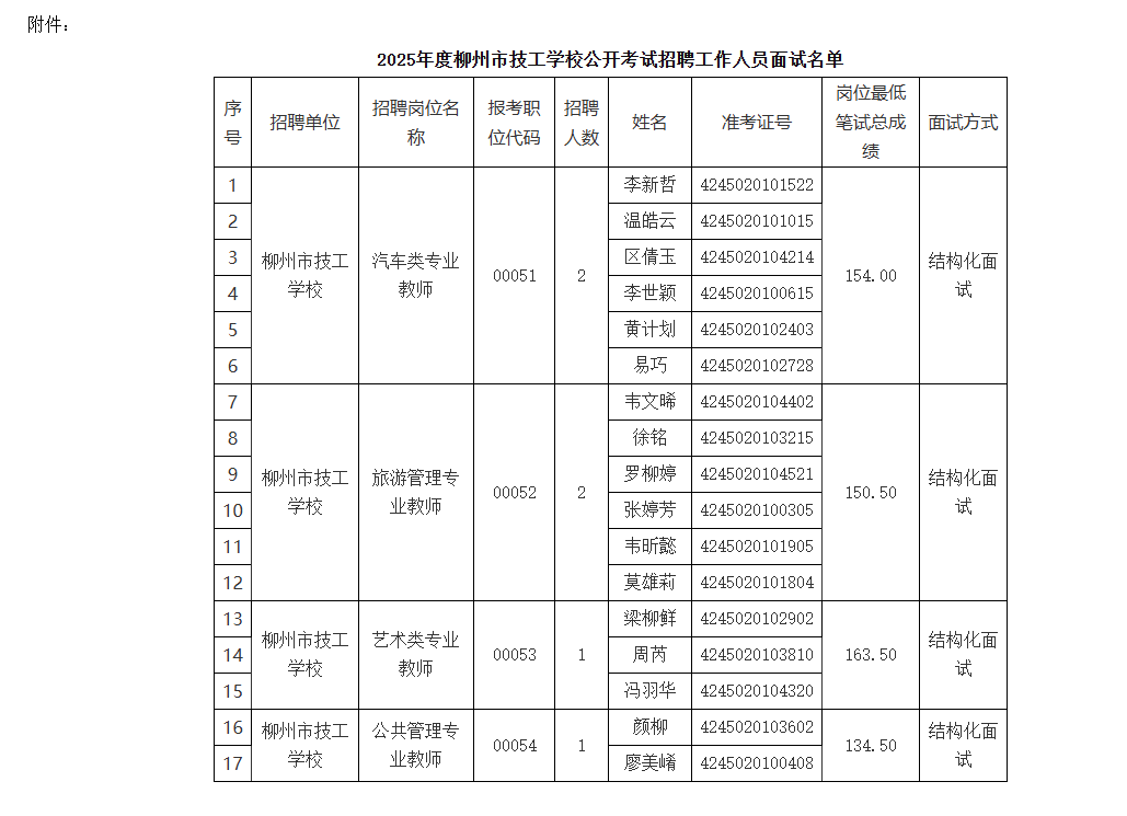 附件:2025年度柳州市技工學(xué)校公開(kāi)考試招聘工作人員面試名單