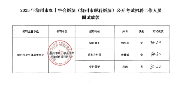 2025年度柳州市紅十字會(huì)醫(yī)院(柳州市眼科醫(yī)院)公開招聘中高級(jí)(急需緊缺)人才(第二批)面試成績公示