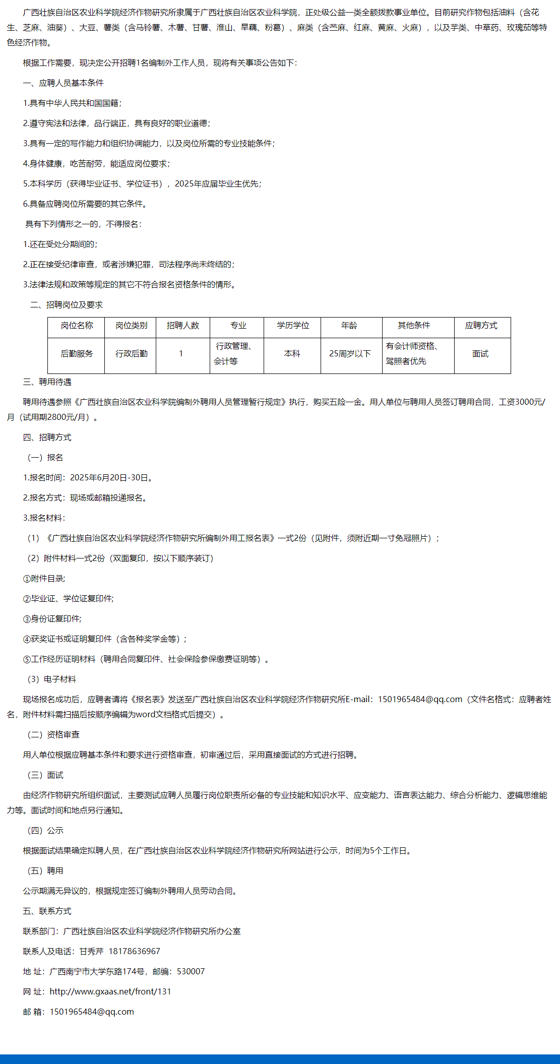 2025年廣西壯族自治區(qū)農(nóng)業(yè)科學(xué)院經(jīng)濟(jì)作物研究所招聘編制外工作人員1人