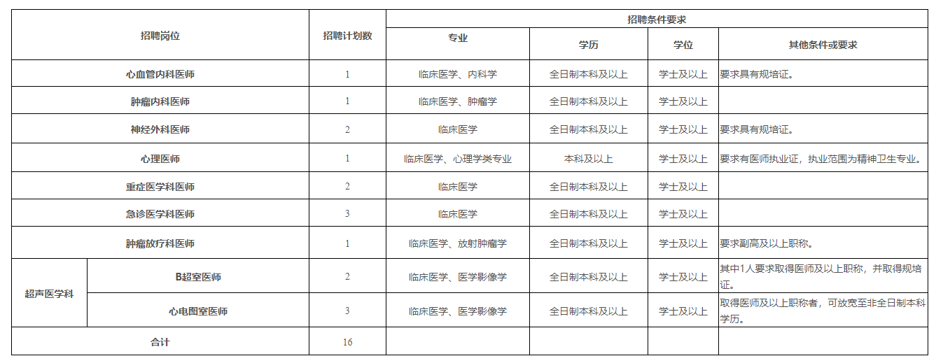 注:初中級(jí)職稱應(yīng)聘人員原則上年齡要求為35周歲及以下;如為副高以上職稱,年齡可放寬至45周歲;學(xué)歷層次高者優(yōu)先。醫(yī)師崗位中如要求具有規(guī)培證條件的是指已取得規(guī)培合格證書(含通過規(guī)培結(jié)業(yè)考試未領(lǐng)合格證書)或已取得中級(jí)及以上職稱人員。