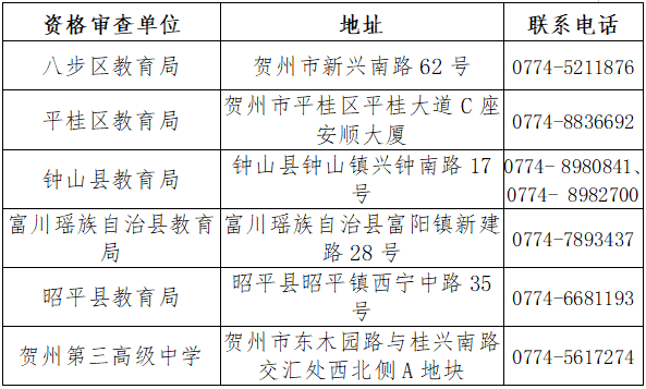 詳見已發(fā)布的《2025年賀州市中小學(xué)(幼兒園)教師公開招聘簡(jiǎn)章》附件1《2025年賀州市中小學(xué)(幼兒園)教師公開招聘崗位計(jì)劃表》,資格審查單位信息如下表: