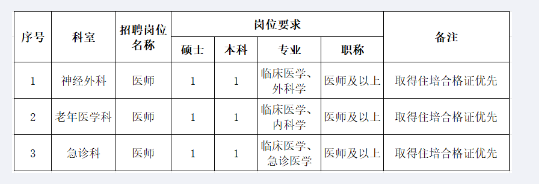 根據(jù)醫(yī)院發(fā)展需要,現(xiàn)面向社會急招神經(jīng)外科、老年醫(yī)學(xué)科、急診科醫(yī)師,有關(guān)招聘事項公告如下: