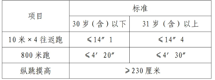 體能測評項目中,縱跳摸高的測試次數(shù)不超過3次,10米×4往返跑測評次數(shù)為2次,1000米/800米的測評次數(shù)均為1次。應聘勤務崗位的人員,體能測評三項全部達標的方為合格;應聘文職崗位的人員,體能測評三項有兩項達標的,視為合格。