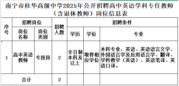 3.網(wǎng)上報(bào)名。應(yīng)聘者需規(guī)范填寫《南寧市桂華高級(jí)中學(xué)公開招聘專任教師報(bào)名表》(見附件2),將個(gè)人應(yīng)聘證明材料一并打包(學(xué)科+姓名+聯(lián)系電話)發(fā)送到nnsghgjzx2022@163.com郵箱。