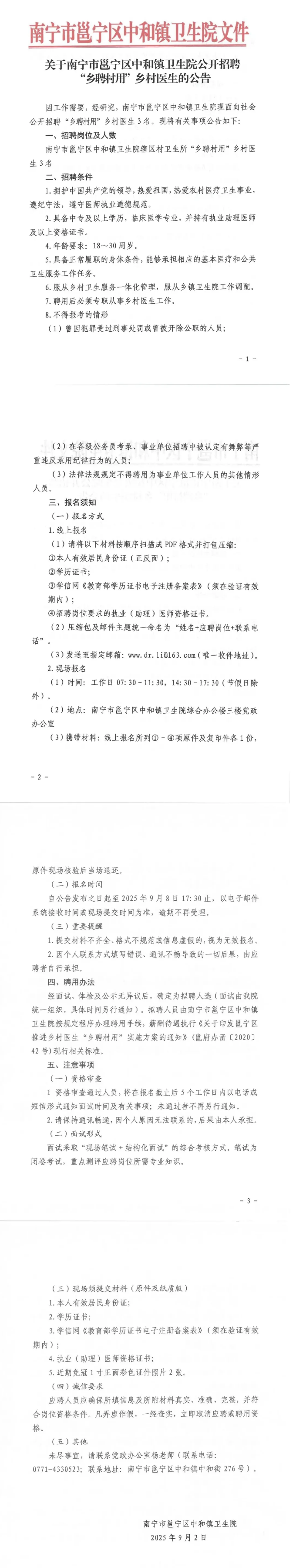 南寧市邕寧區(qū)中和鎮(zhèn)衛(wèi)生院公開招聘“鄉(xiāng)聘村用”鄉(xiāng)村醫(yī)生的公告
