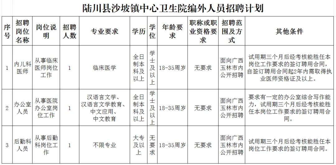 2025年陸川縣沙坡鎮(zhèn)中心衛(wèi)生院公開(kāi)招聘編外人員公告