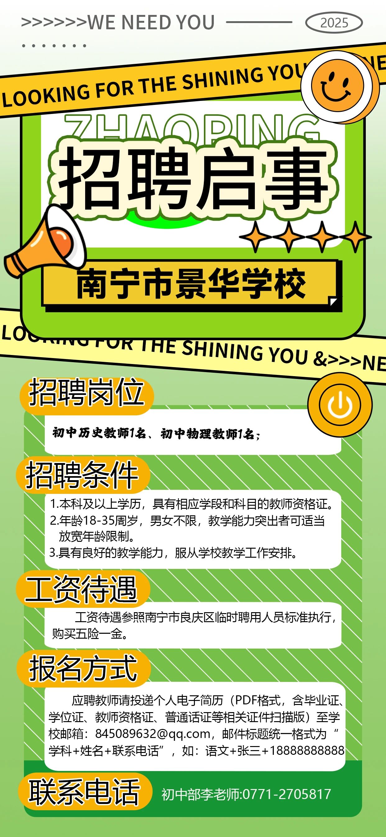 2025年南寧市景華學(xué)校急聘初中歷史教師1名、初中物理教師1名