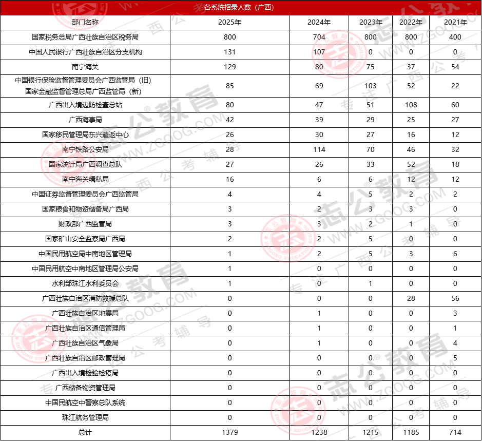 國家稅務(wù)總局廣西壯族自治區(qū)稅務(wù)局常年占據(jù)招錄首位,2025年以376個崗位、800人的招錄規(guī)模,占廣西總招錄人數(shù)的58%。此外,海關(guān)系統(tǒng)對廣西考生較為友好,平均入面分?jǐn)?shù)約117分,比稅務(wù)系統(tǒng)低5分以上,且常面向冷門專業(yè)招錄,可作為特色選擇。