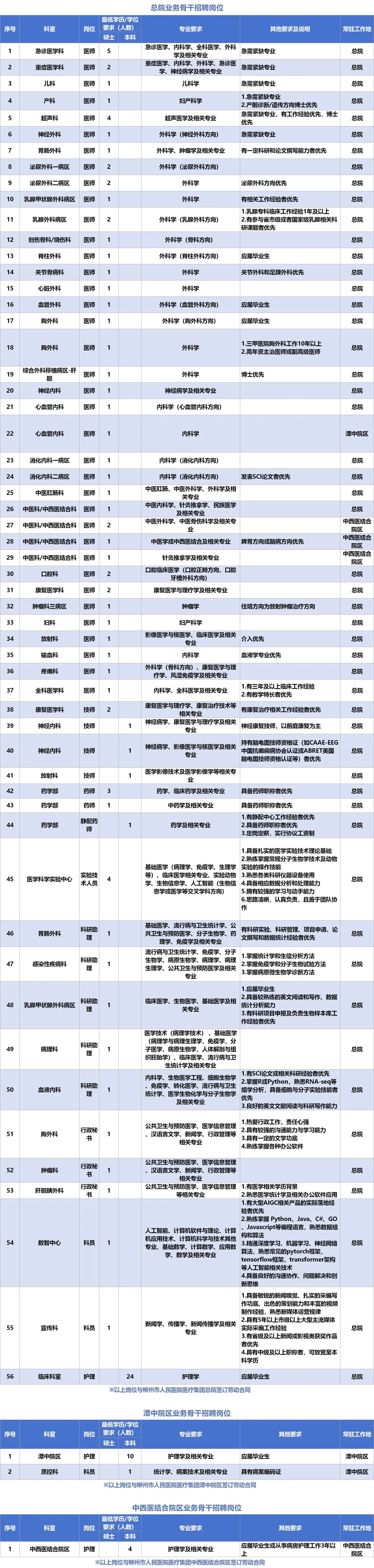 具體招聘公告詳見醫(yī)院官網(wǎng)(https://www.lzry.com.cn/)人員招聘欄目,具體招聘辦法由柳州市人民醫(yī)院解釋,集團院區(qū)待遇按各院區(qū)相關(guān)制度執(zhí)行,由各院區(qū)人力資源部門負責(zé)解釋。