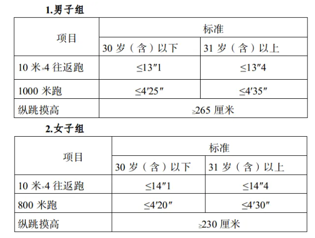 參照《關(guān)于印發(fā)<公安機(jī)關(guān)錄用人民警察體能測評項目和標(biāo)準(zhǔn)>的通知》(公政治〔2024〕60號)執(zhí)行,每個測評項目分別記錄成績。其中縱跳摸高的測評次數(shù)不超過3次,10米×4往返跑測評次數(shù)不超過2次,男子1000米跑、女子800米跑測評次數(shù)均為1次。