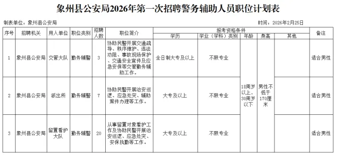 (一)招聘人數(shù):30人,詳見《象州縣公安局2026年第一次公開招聘警務(wù)輔助人員職位計劃表》(附件1)