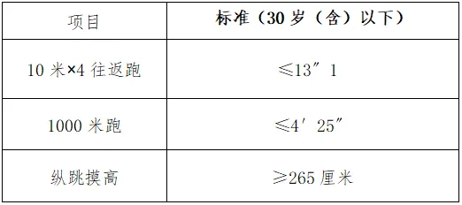 體能測評項目中,縱跳摸高的測試次數(shù)不超過3次,10米×4往返跑測評次數(shù)為2次,1000米跑的測評次數(shù)為1次。應(yīng)聘人員體能測評三項全部達標(biāo)的方為合格。